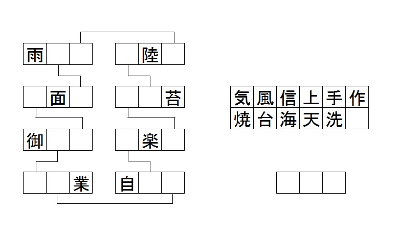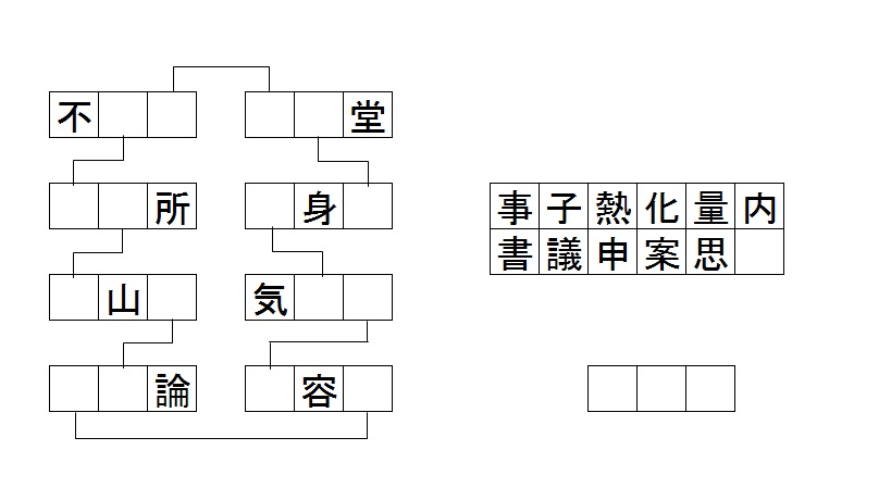 リストの漢字を使って三字熟語のリレーが出来ます。線で結ばれたマスには同じ漢字が入ります。
